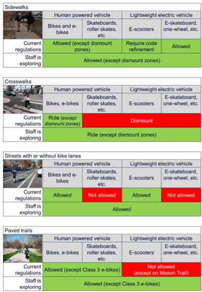 - Sidewalks: possible restrictions on faster-moving devices to protect walkers.